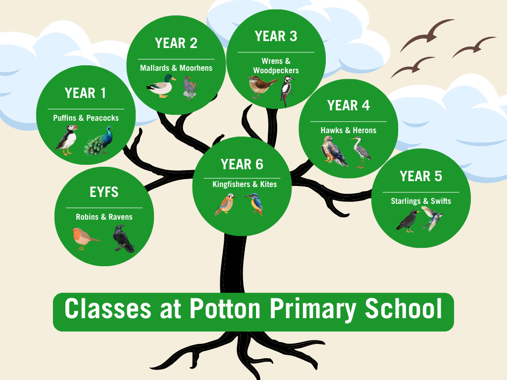 In fitting with our identity and logo, Potton Primary School classes are named after birds.